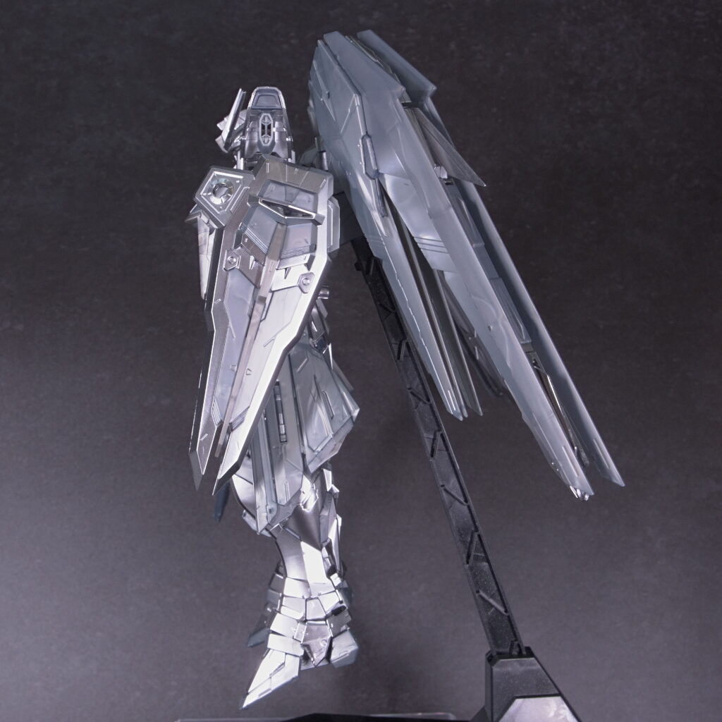 素組み状態でも圧倒的な存在感を誇るのがシルバーコーティング版の魅力です。光源によってメタリック感が変化し、正面からも背面からも立体的な情報量を感じられます。Ver.2.0のスマートなプロポーションとシルバーメッキの相性は抜群で、飾るだけで映えるキットです。