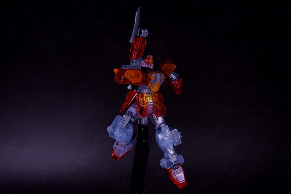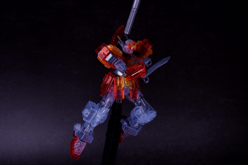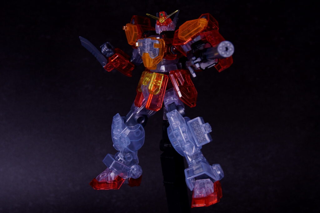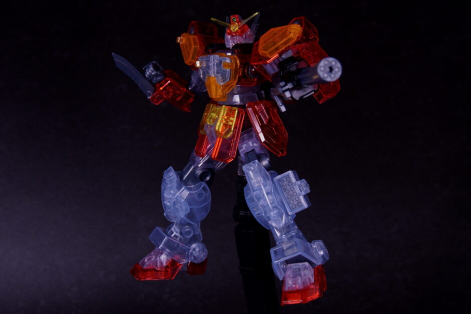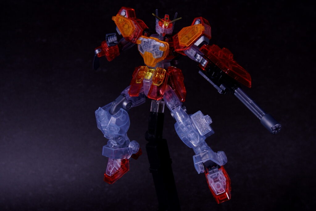 白×赤×オレンジを基調としたクリア成形で、重火器満載のシルエットが一層際立ちます。胸部ガトリングや肩・脚部のミサイルポッドは展開可能で、内部構造が透けて見えることで情報量が増加。素立ち状態でも存在感抜群です。