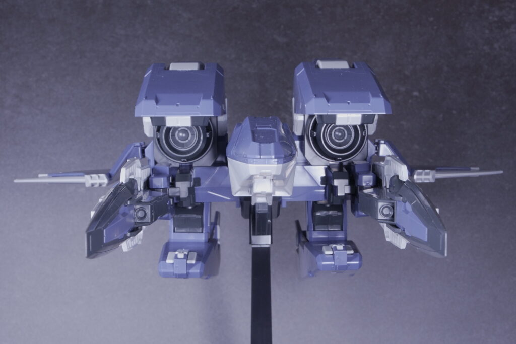 ネイビーとグレーを基調とした落ち着いた成形色が重厚感を引き立て、巨大メカらしい存在感をしっかりと表現しています。