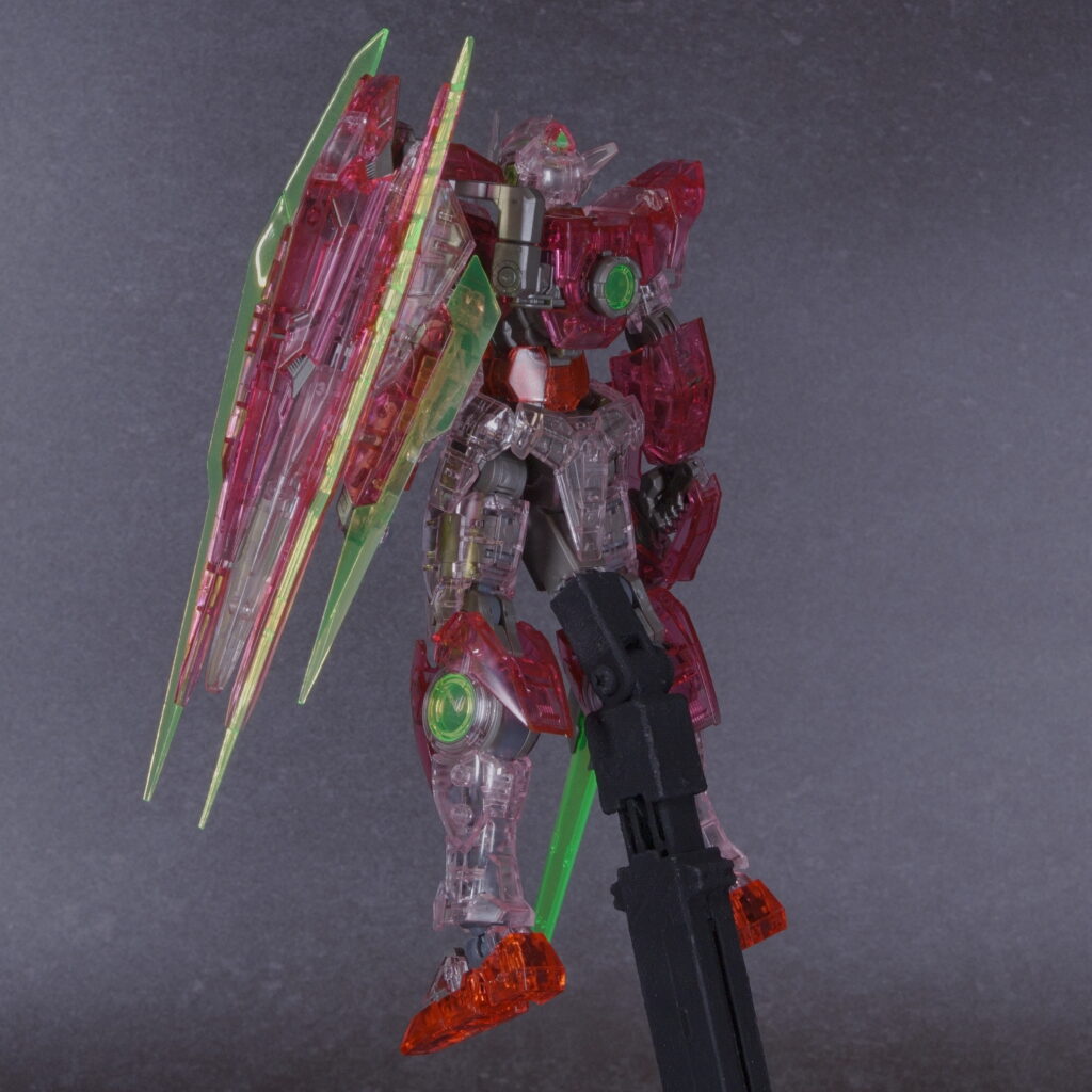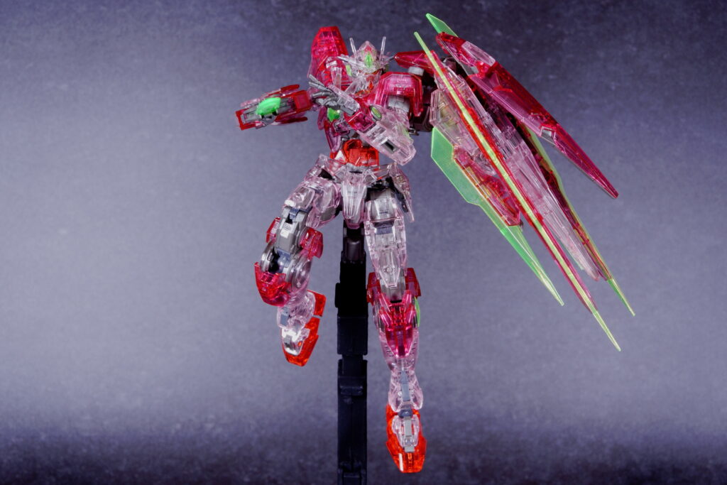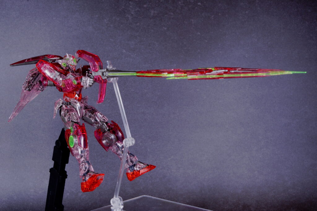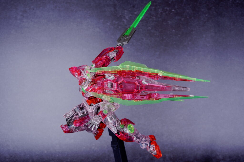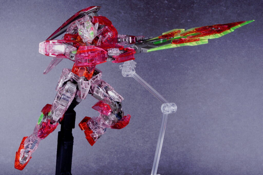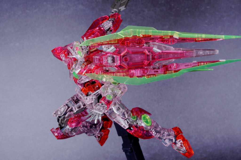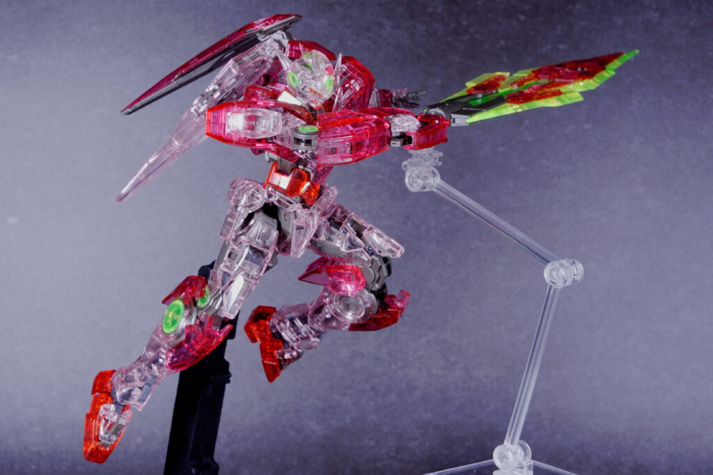 | デザイン、プロポーション | RGフォーマットにより、劇中機体のフォルムを精密に再現。 トランザムカラーの赤系クリアが全体に馴染み、繊細な装甲ラインを引き立てる。 クリア材特有の“光の反射”がデザインの立体感を強調。 |