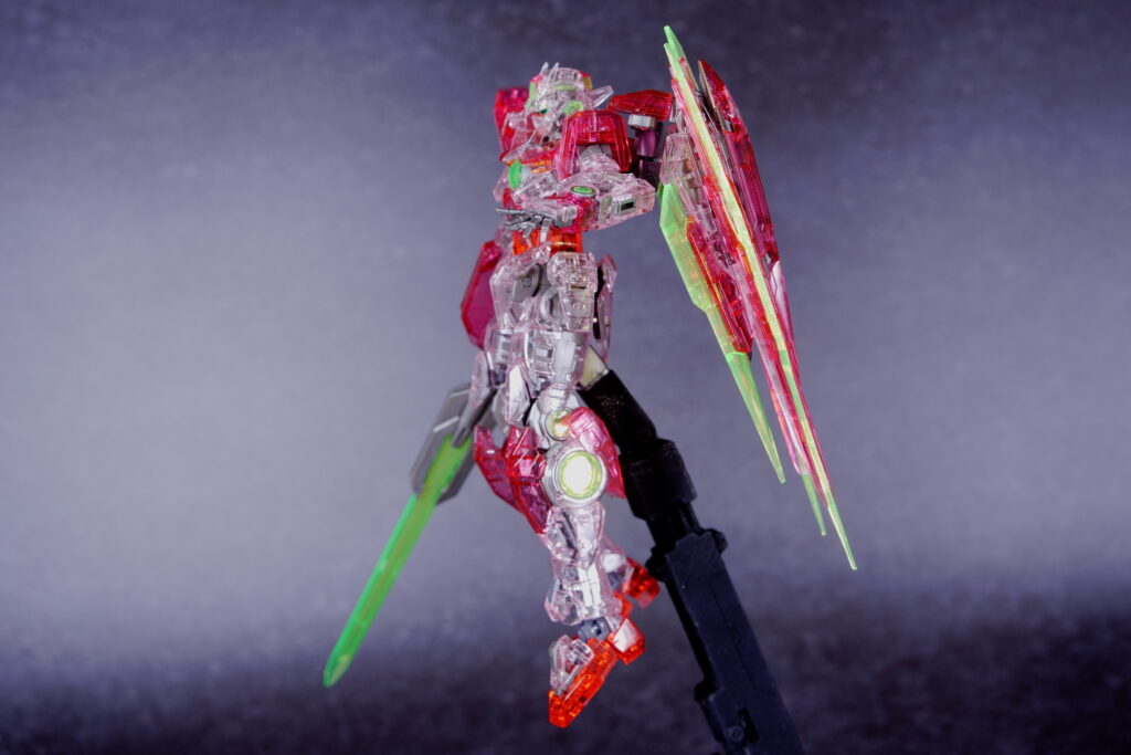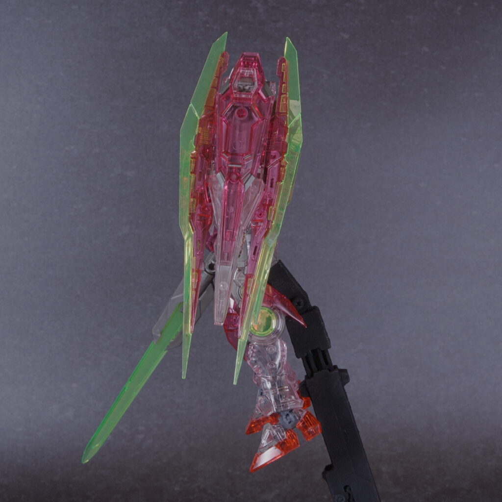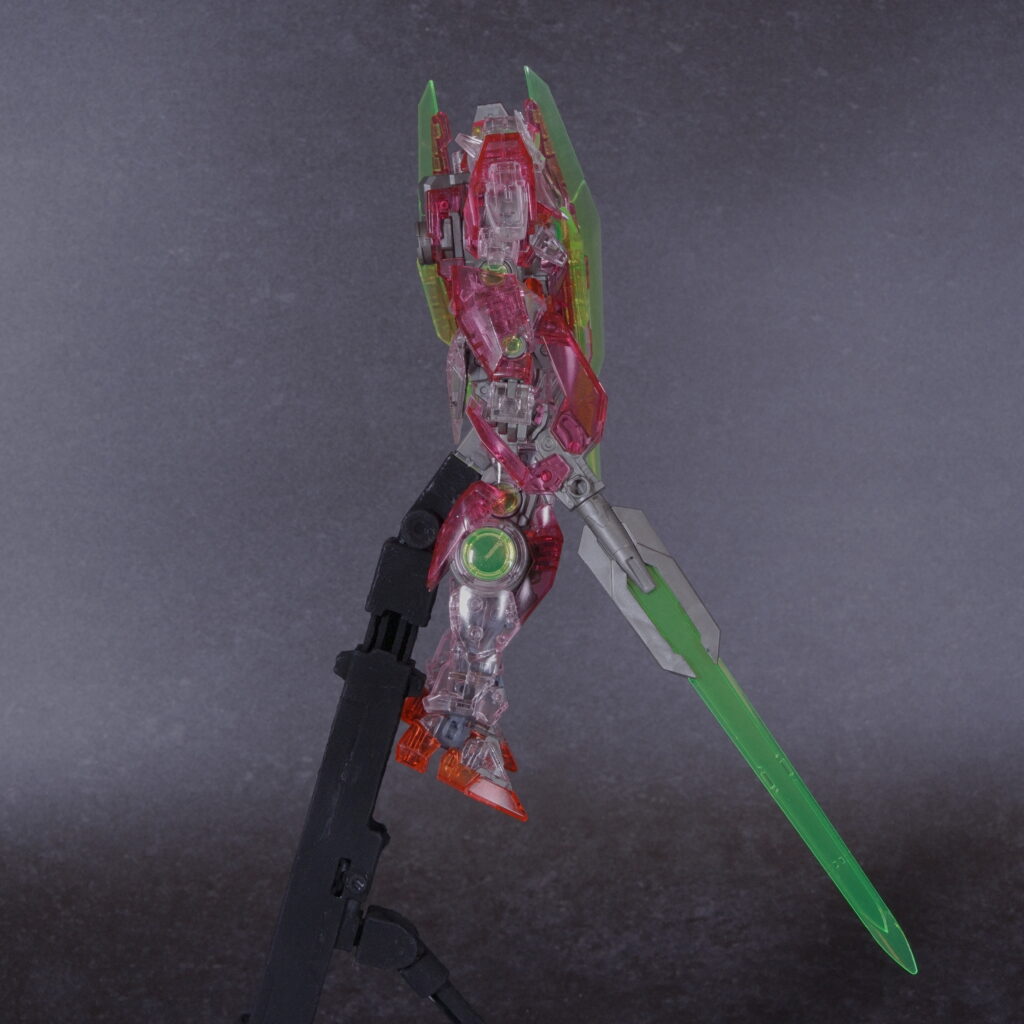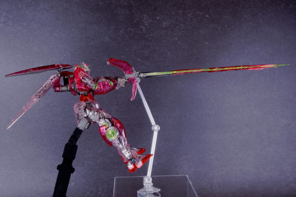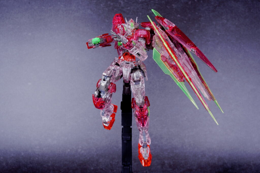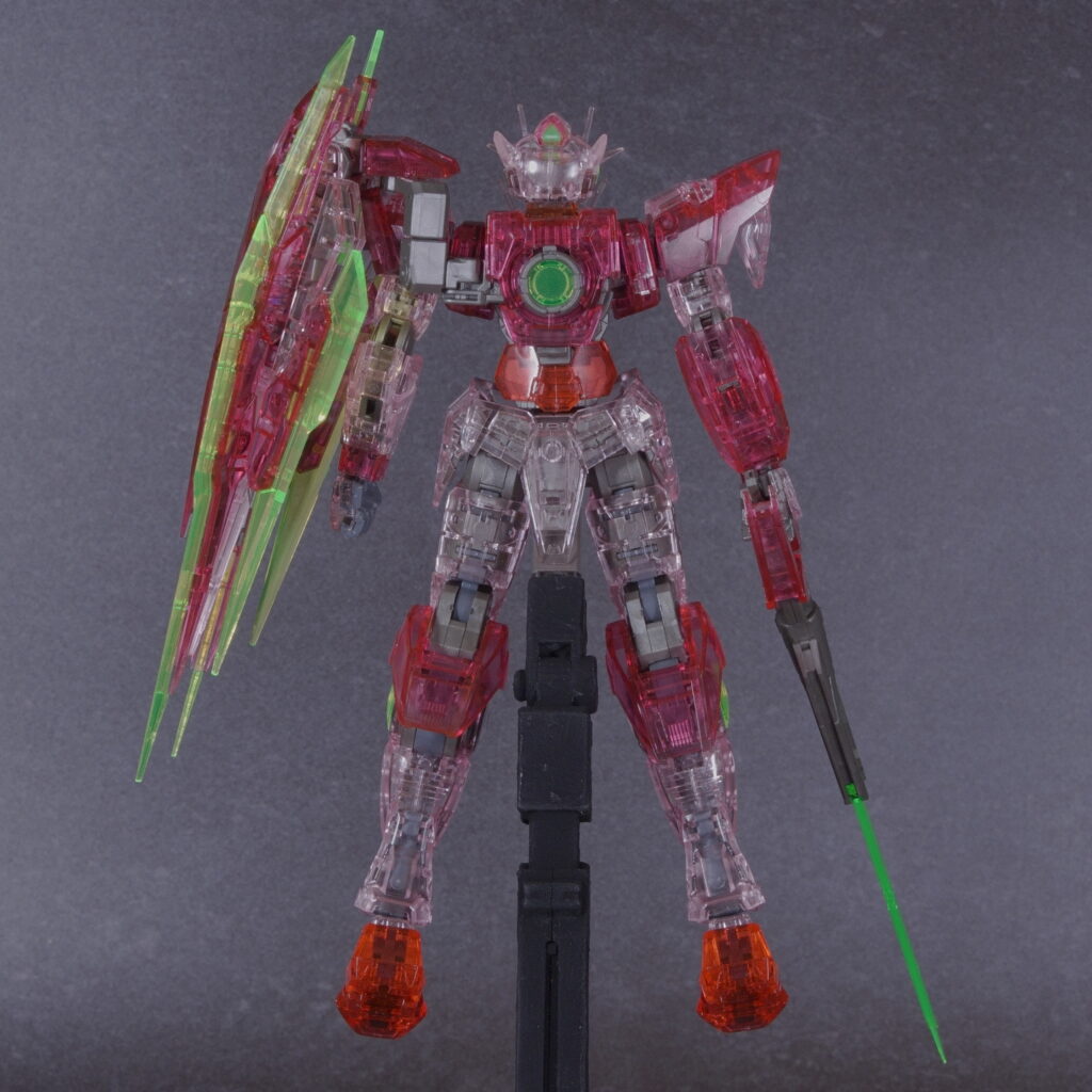 | デザイン、プロポーション | RGフォーマットにより、劇中機体のフォルムを精密に再現。 トランザムカラーの赤系クリアが全体に馴染み、繊細な装甲ラインを引き立てる。 クリア材特有の“光の反射”がデザインの立体感を強調。 |
