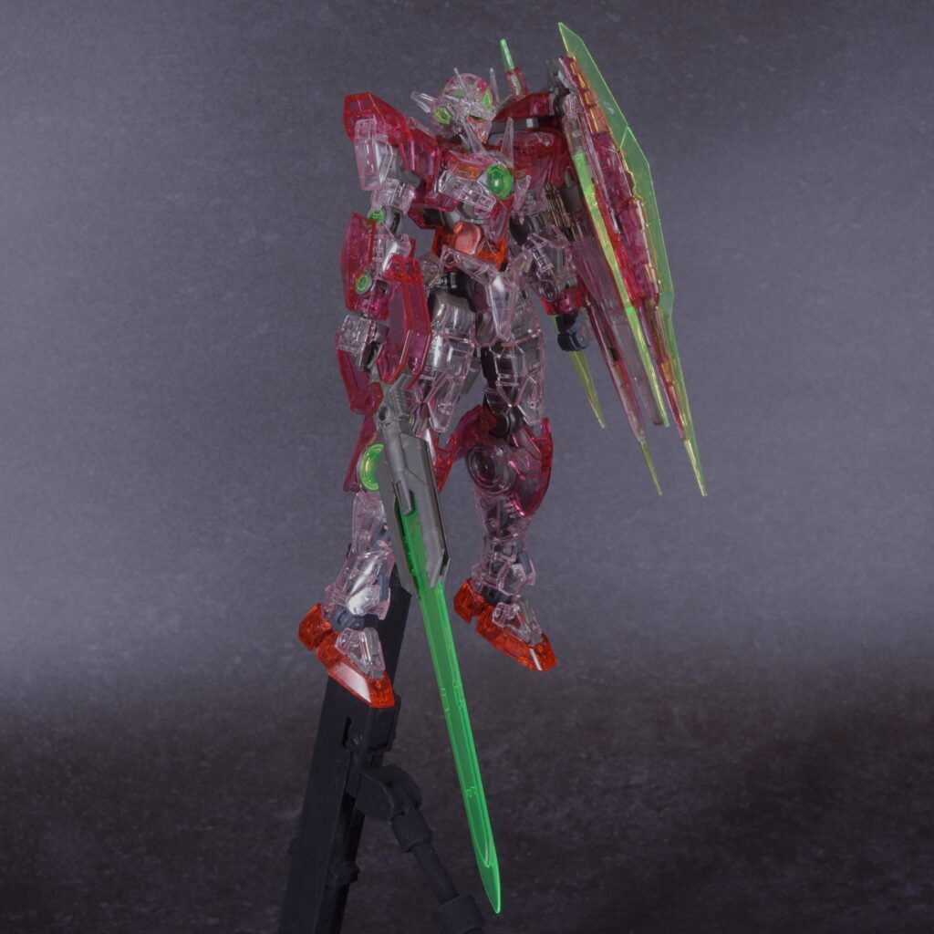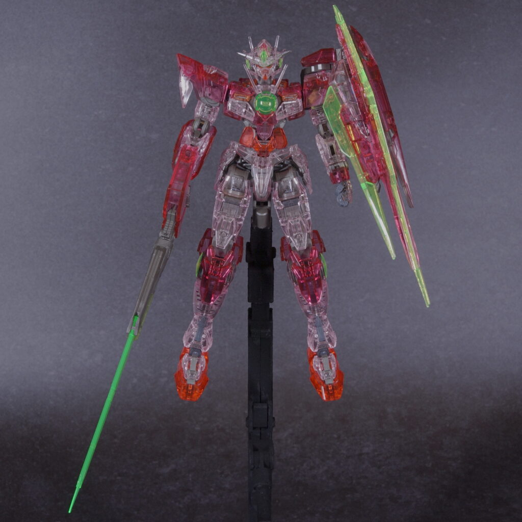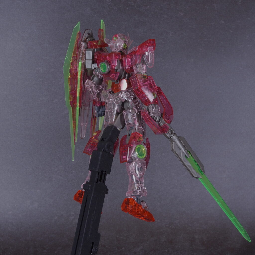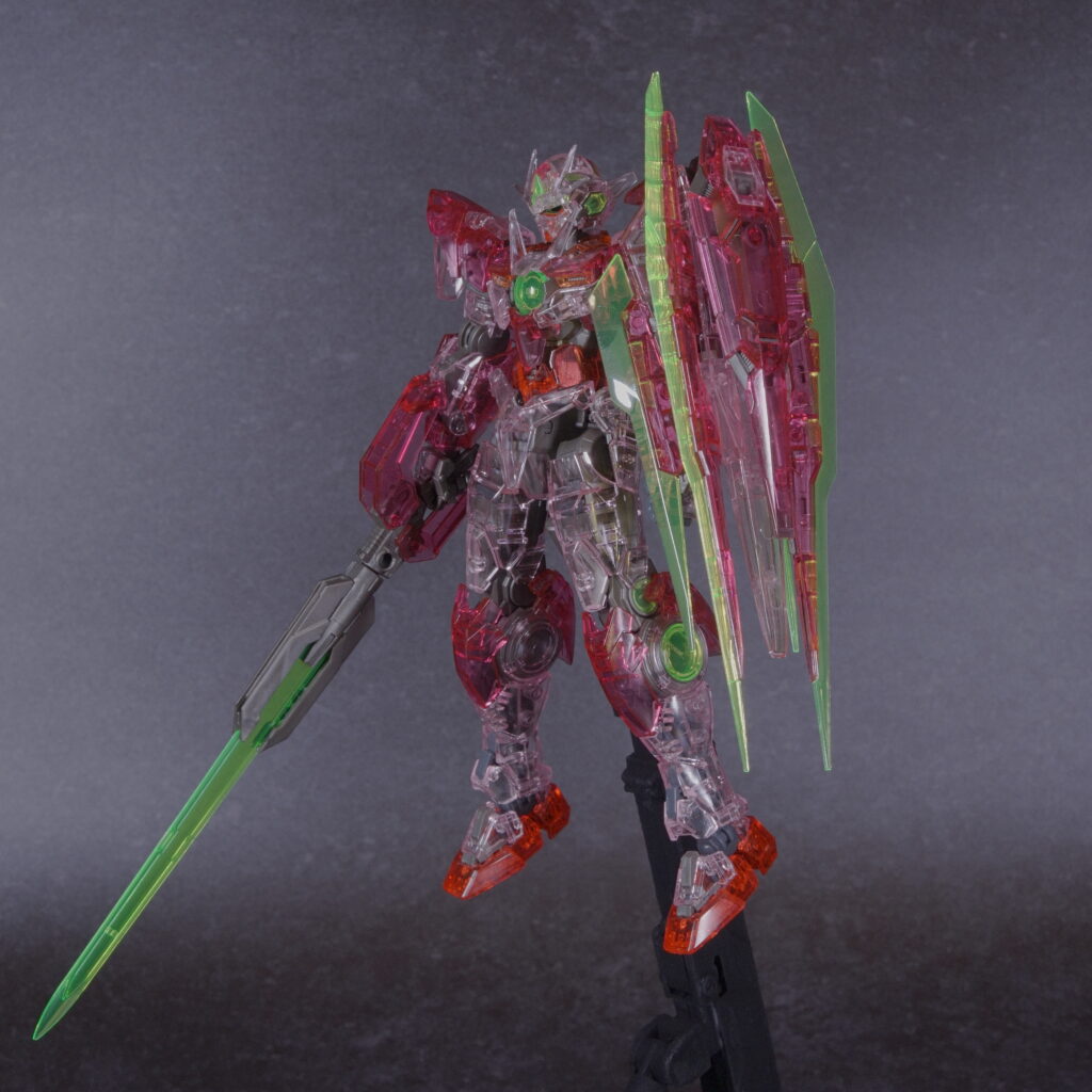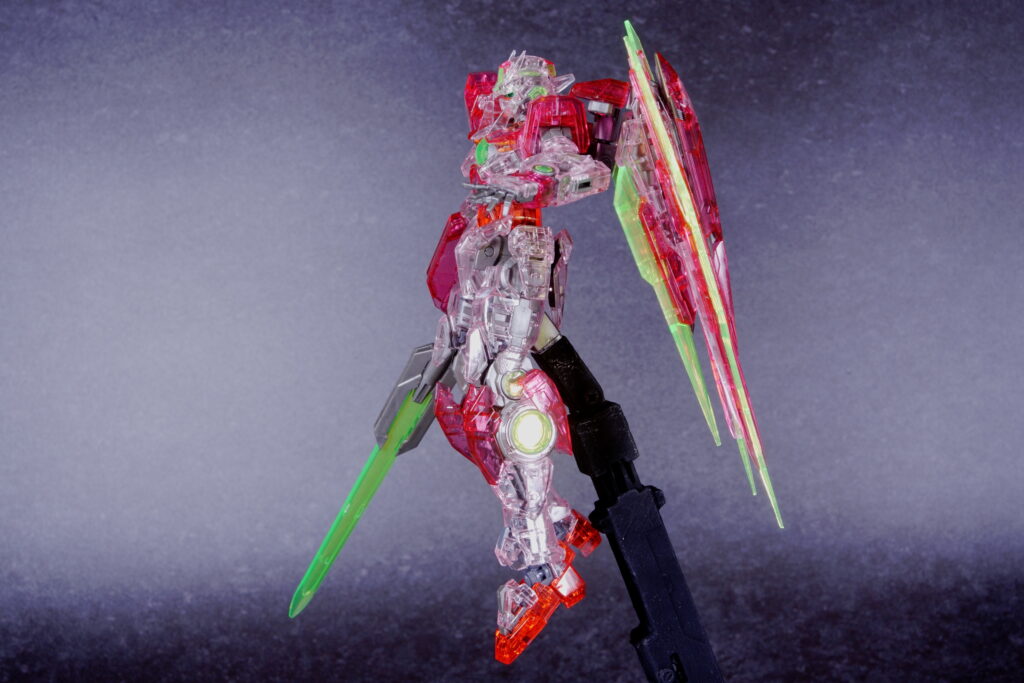 | デザイン、プロポーション | RGフォーマットにより、劇中機体のフォルムを精密に再現。 トランザムカラーの赤系クリアが全体に馴染み、繊細な装甲ラインを引き立てる。 クリア材特有の“光の反射”がデザインの立体感を強調。 |