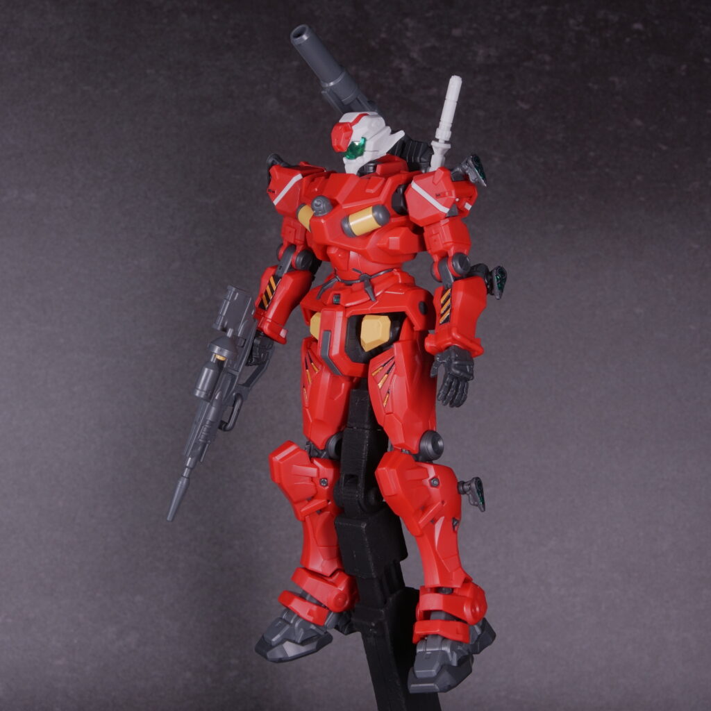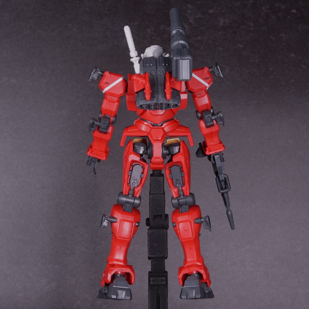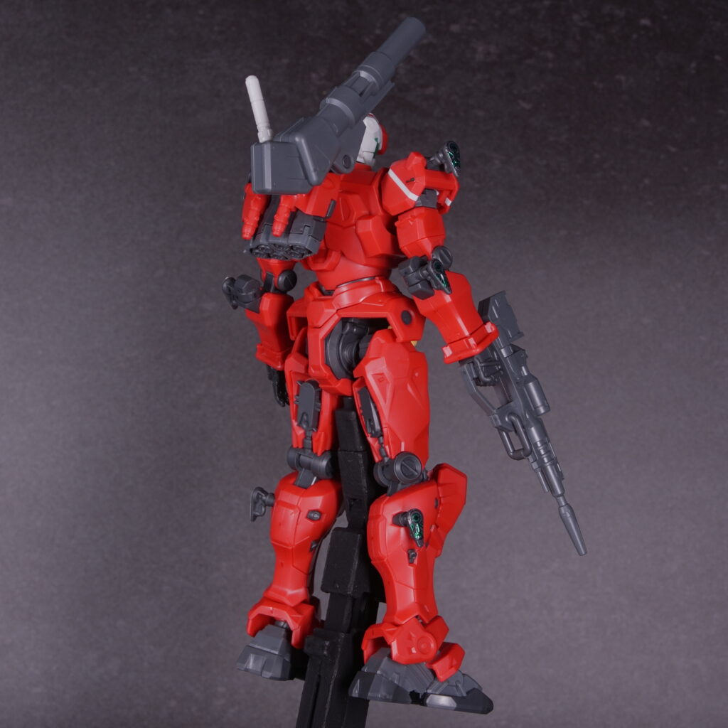素組み状態でも情報量がしっかり確保されており、立たせておくだけで「高機動キャノン機」という設定が伝わってくる仕上がりになっています。