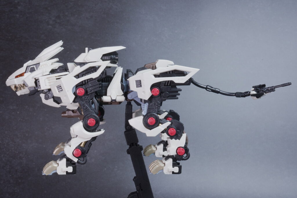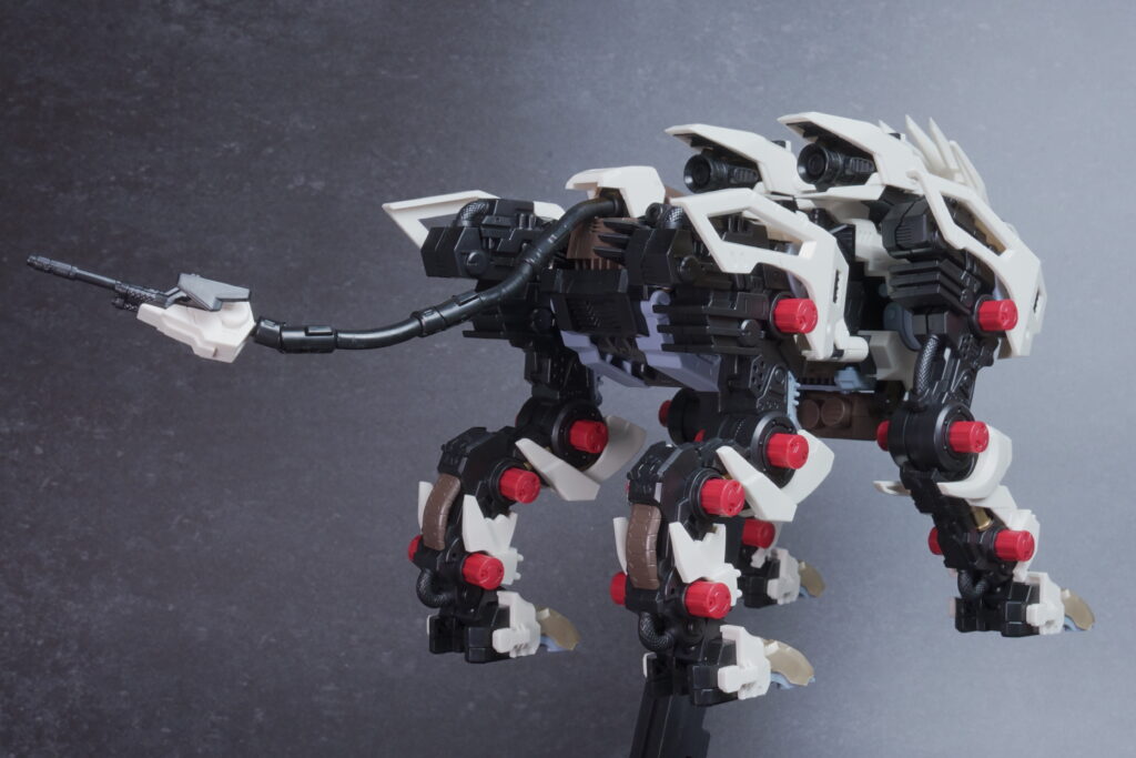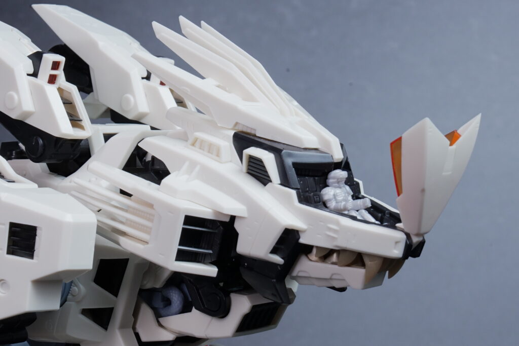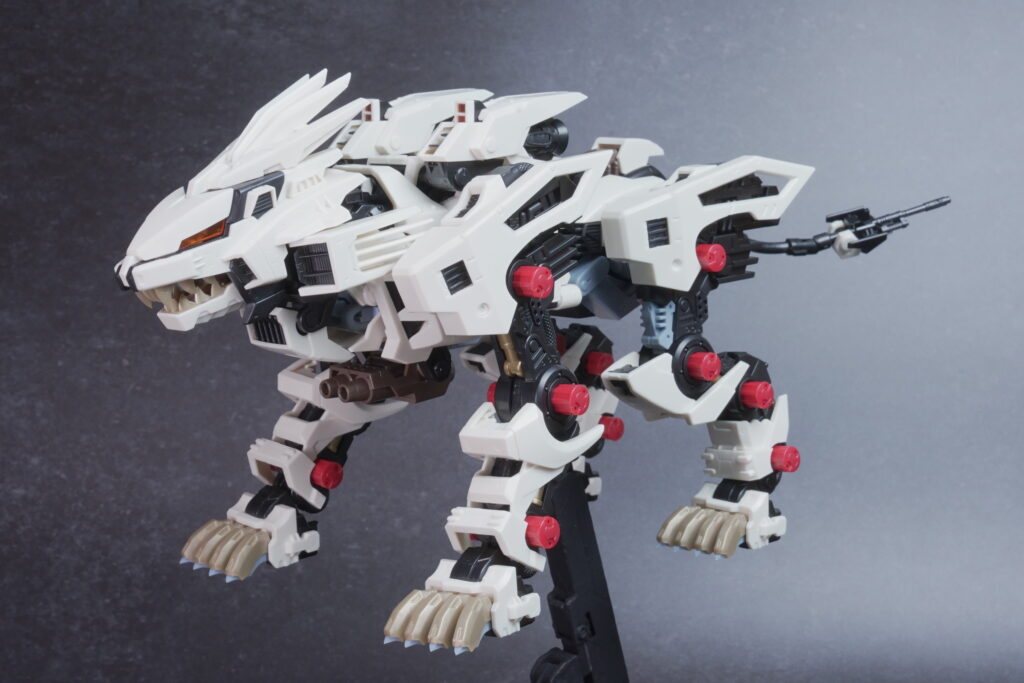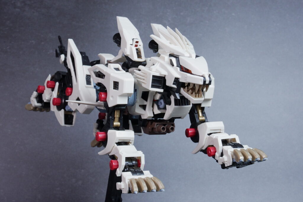 完成したライガーゼロは、ホワイト主体の成形色が非常に美しく映え、素組みでも精悍なシルエットに仕上がります。 装甲の隙間から覗く内部フレーム(ゾイドコア周辺や関節部)がメカニカルなリアリティを醸し出しており、実在する兵器のような説得力があります。