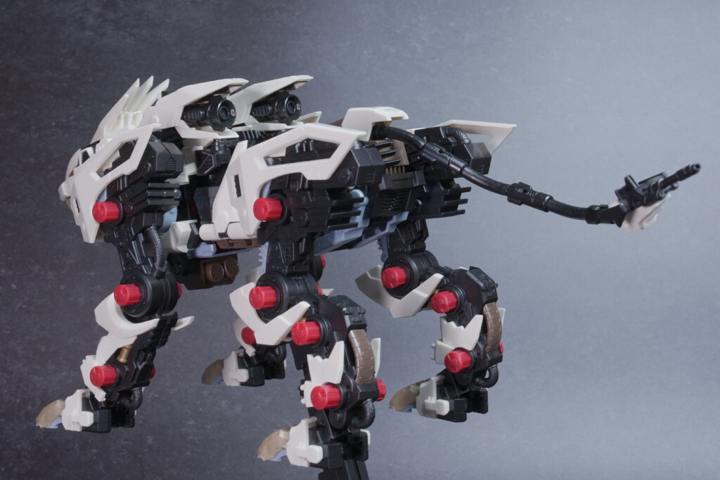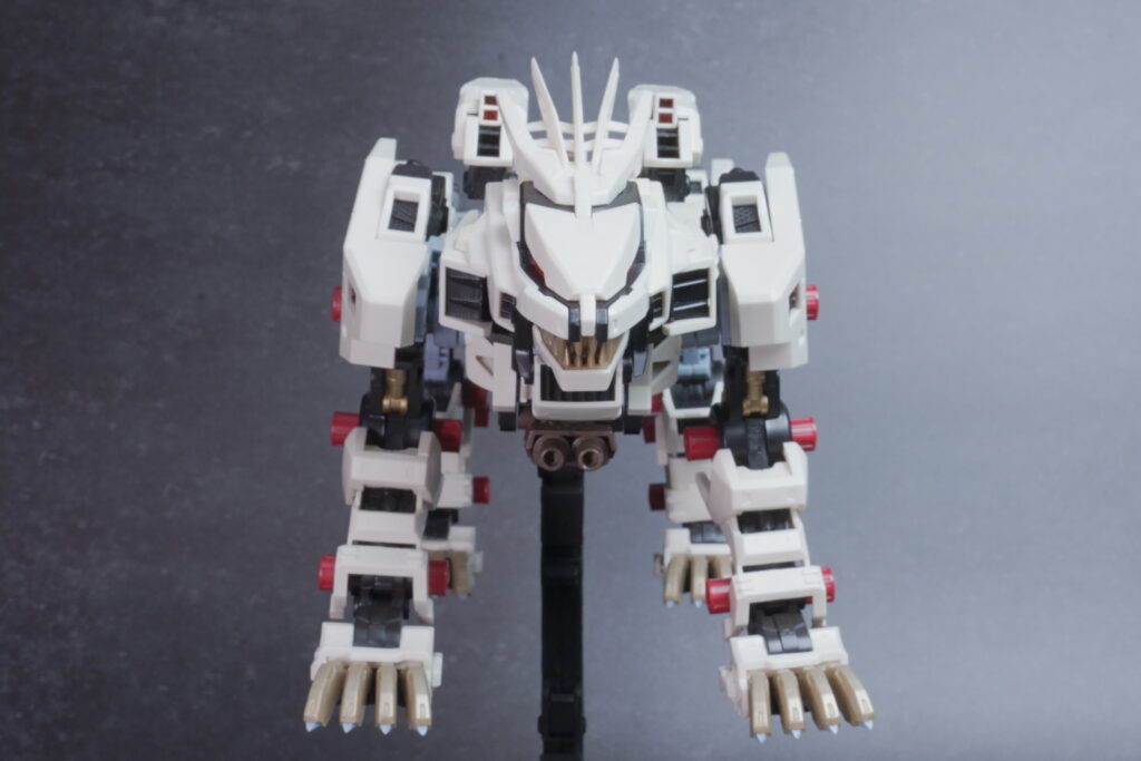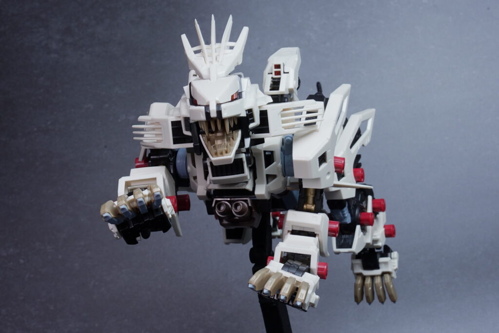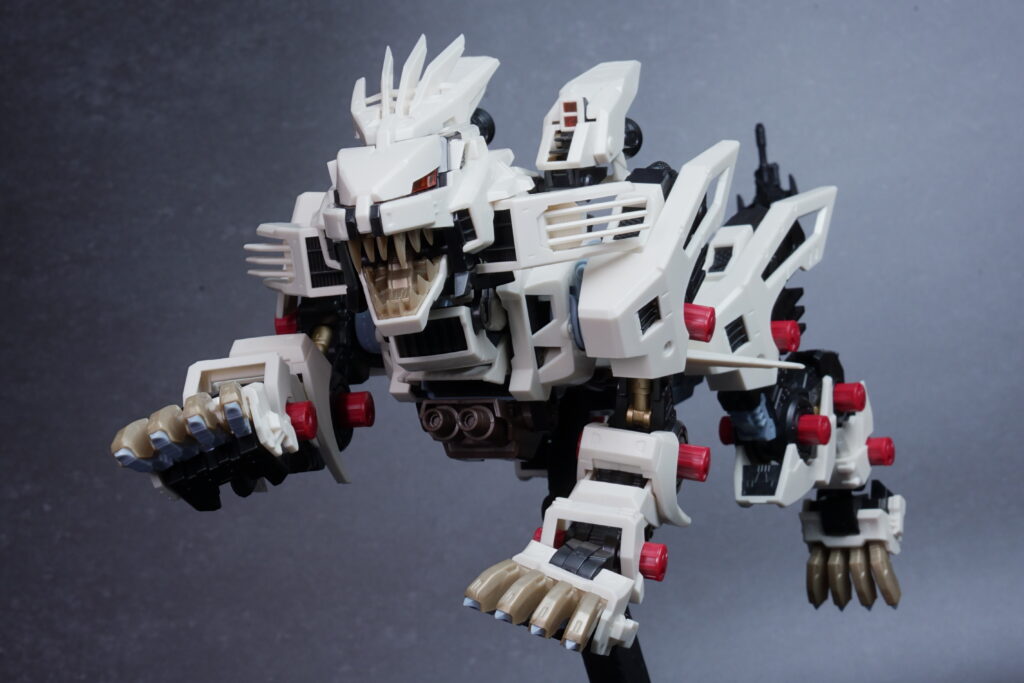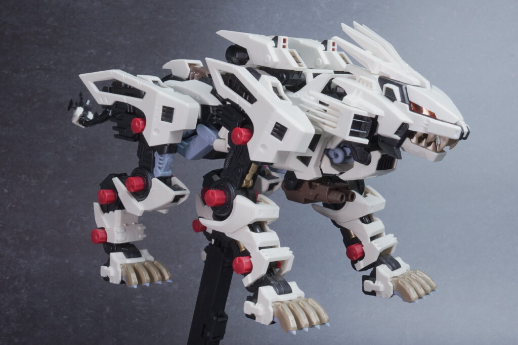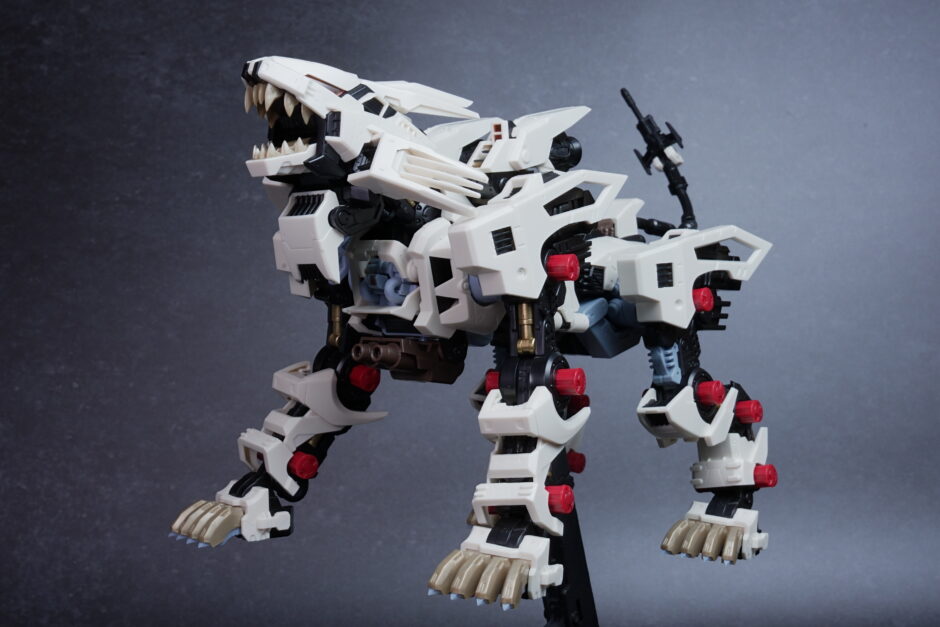 完成したライガーゼロは、ホワイト主体の成形色が非常に美しく映え、素組みでも精悍なシルエットに仕上がります。 装甲の隙間から覗く内部フレーム(ゾイドコア周辺や関節部)がメカニカルなリアリティを醸し出しており、実在する兵器のような説得力があります。
