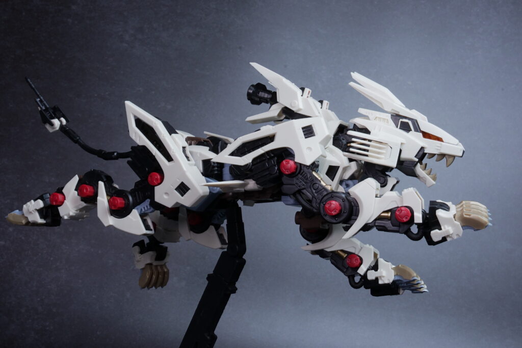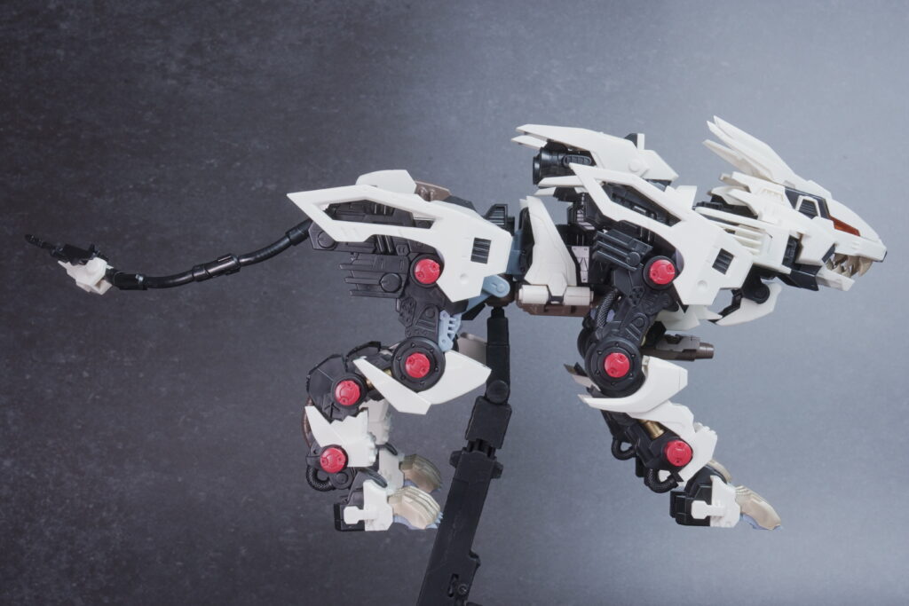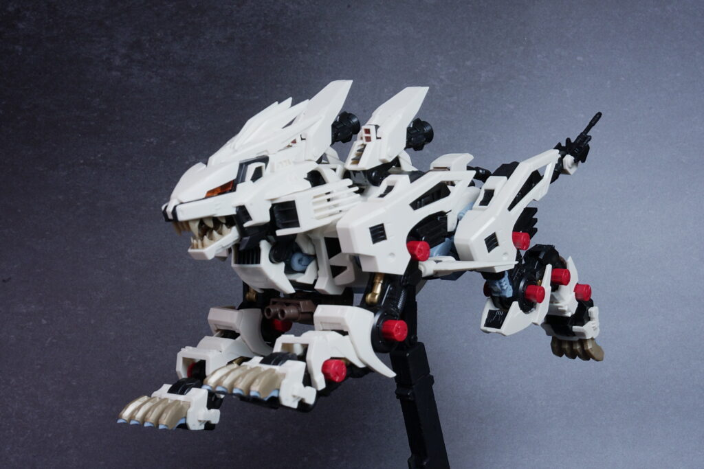 可動フレームを活かした“生物的な動き”がつけやすく、素組みでも白い外装がシャープに映える満足度の高い一体です。低姿勢の狩猟ポーズから躍動感ある展示まで自在に楽しめます。
