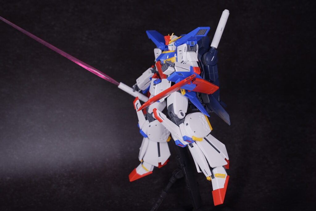 大型キットながら関節可動は素直で、腰の捻りや肩の引き出しも可能。 ダブル・ビーム・ライフルやハイパー・ビーム・サーベルを構えたダイナミックなアクションポーズもビシッと決まります。 |