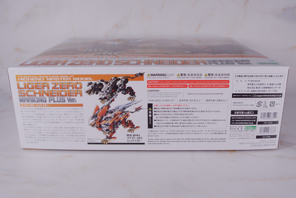 オレンジ色の装甲を輝かせ、無数のブレードを展開して突撃するライガーゼロ・シュナイダーが描かれた大迫力のパッケージ。 HMMシリーズらしい精密なイラストは、箱のまま飾っておきたくなるほどのクオリティです。 |