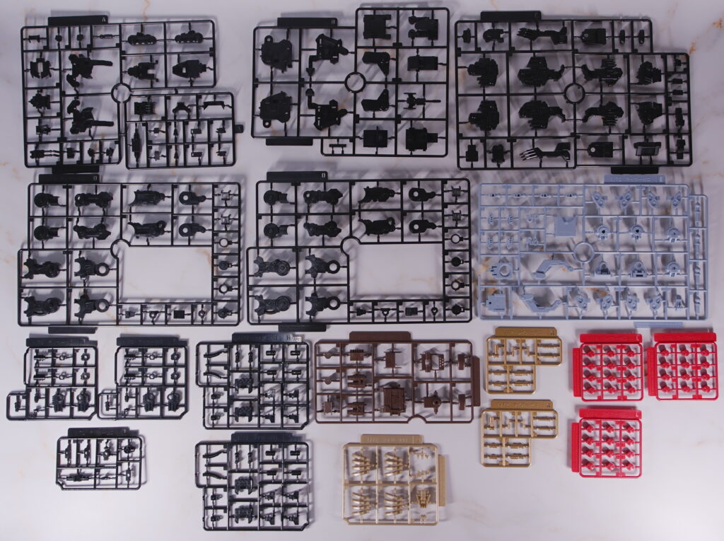 ・無数のブレードやフィンなど、尖っている部品や薄い部品が多いため、破損やケガに注意が必要です。 ・細長いパーツが多く、ゲート処理時に白化しやすい箇所があるため、丁寧なニッパーワークが求められます。 ・アクションポーズ時の保持力を高めるため、一部の装甲パーツなどは接着剤を使用したほうが安定します。 |