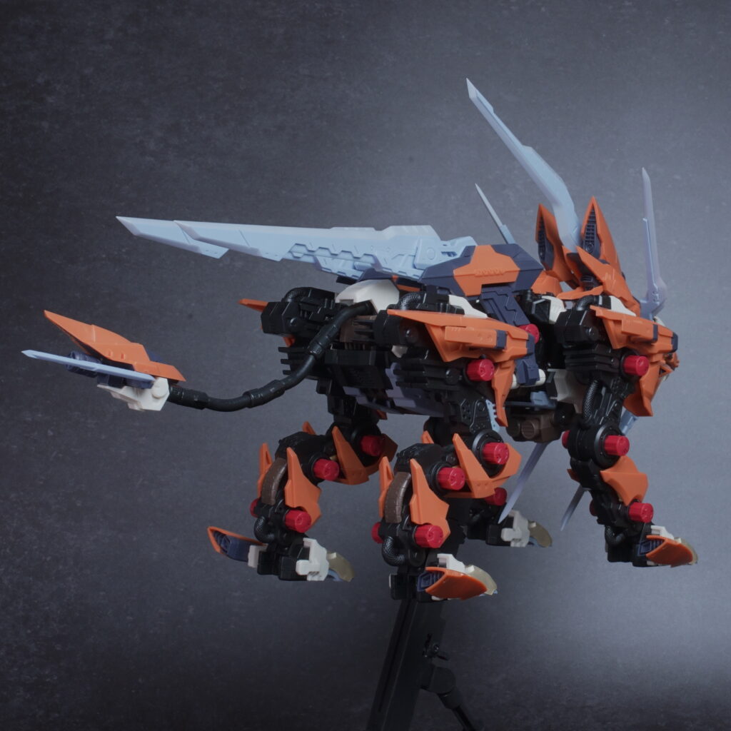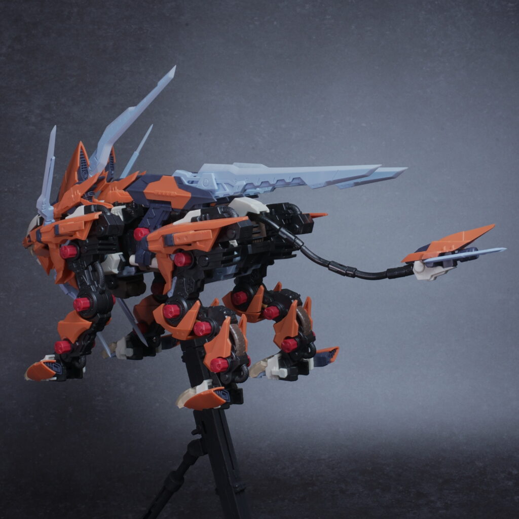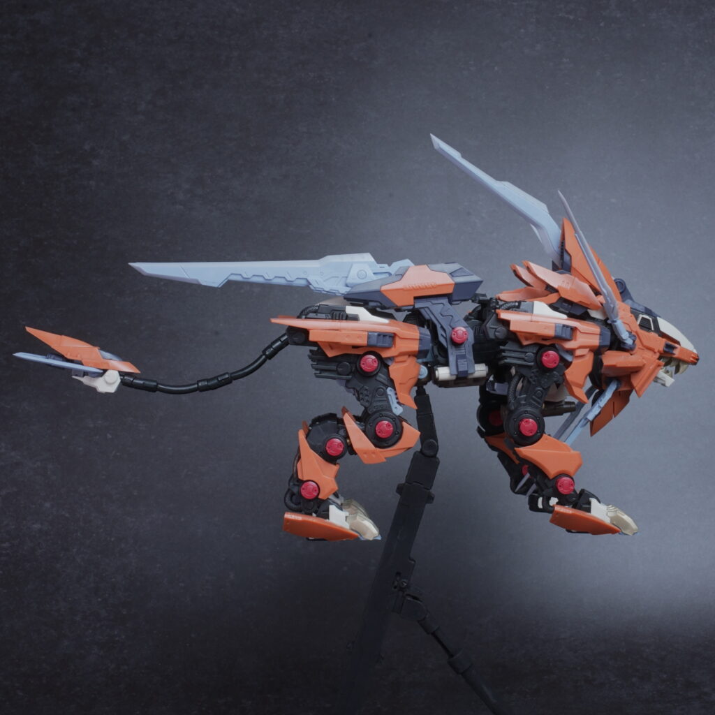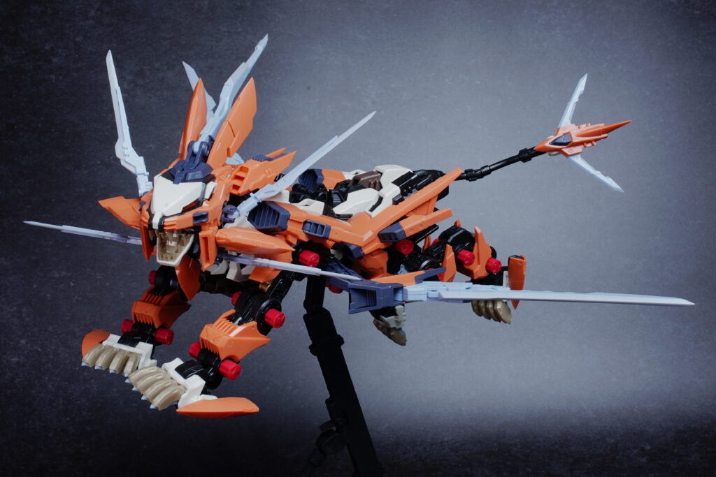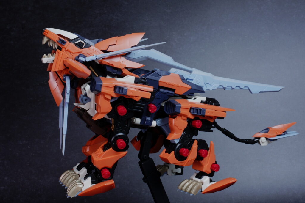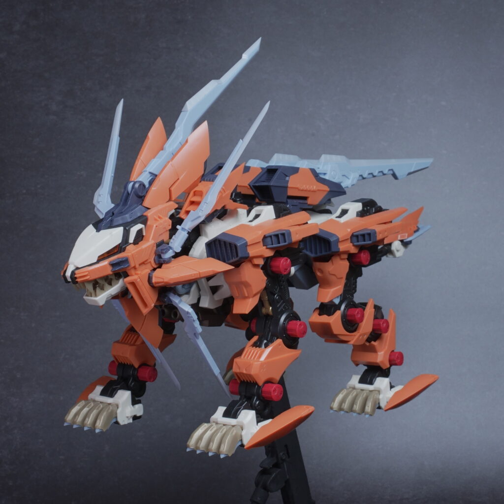 鋭利なパーツが多く取り扱いには丁寧さが求められますが、素組みでも鮮烈なオレンジと鋭いシルエットで、ディスプレイ映えは間違いなく抜群。ライガーゼロの進化系統の中でも、特に攻撃的な格好良さを求める方にぜひ手に取っていただきたいキットです。
