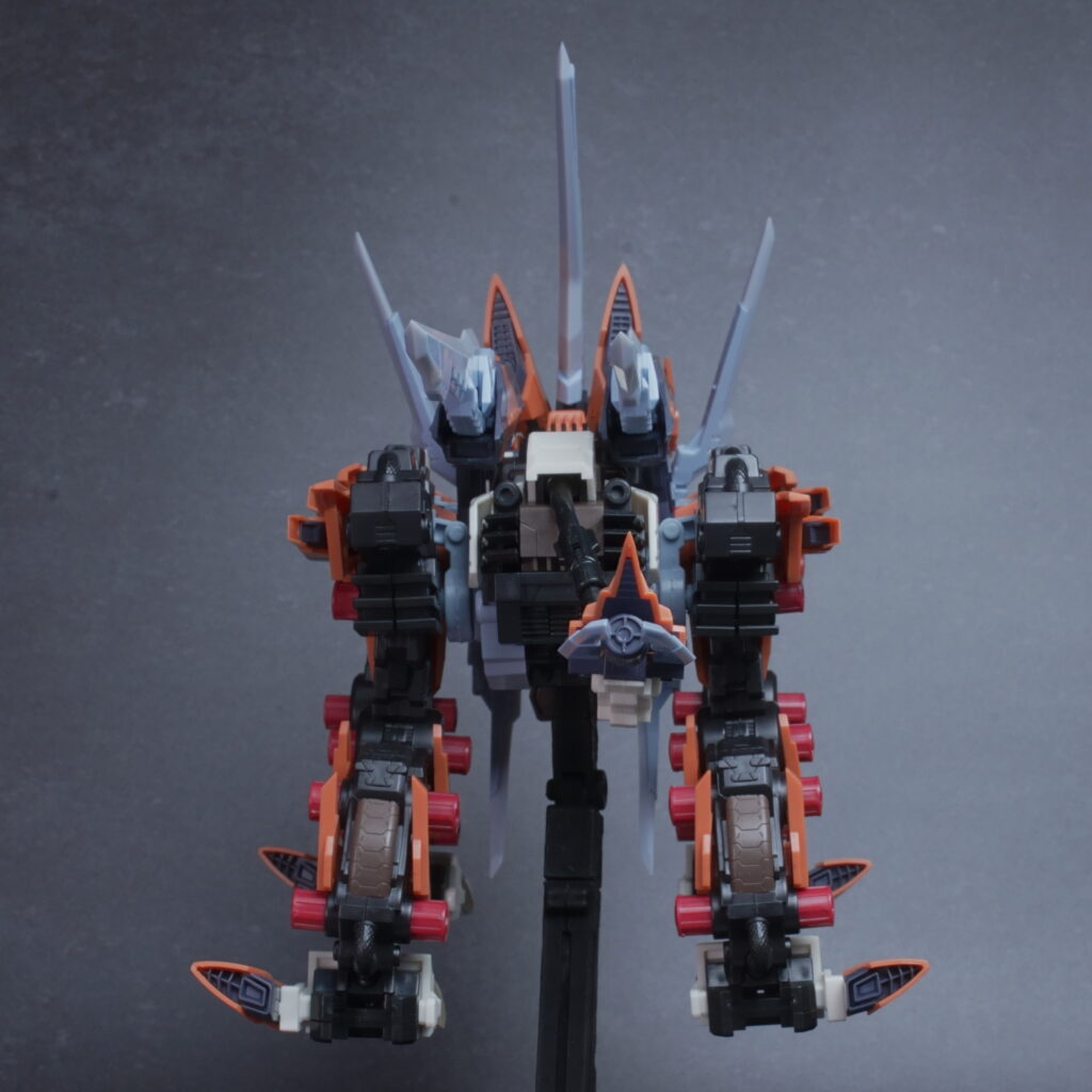 全身に配された「レーザーブレード」の密度感が凄まじく、ライガーゼロ本来のスリムなラインを保ちつつも、一回り逞しくなった力強いプロポーションを再現。 オレンジのパーツは発色が良く、つや消しを吹くだけでもさらに化けそうな仕上がりです。 |