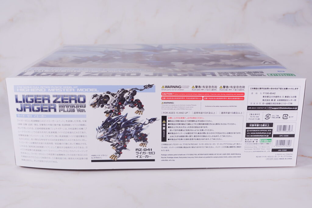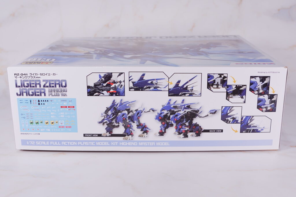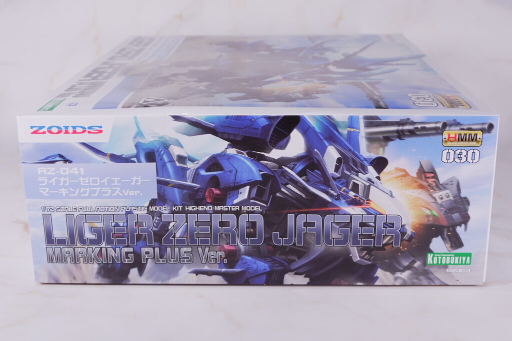 青い閃光を纏いながら疾走するライガーゼロ イエーガーが描かれた、HMMシリーズらしい躍動感溢れるパッケージ。 マーキングプラス版として、背面の大型イオンブースターを強調したメカニカルで迫力のあるアートワークが特徴です。 |