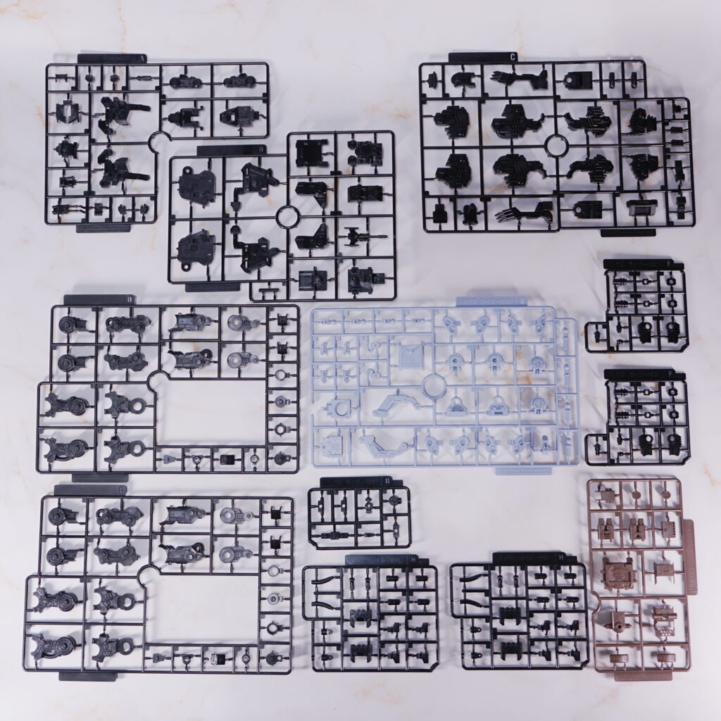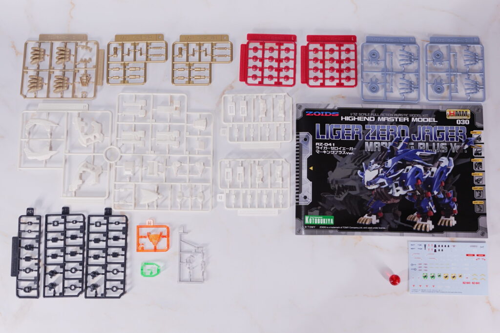 HMMらしい高密度なパーツ構成で、特にライガー素体とイエーガーユニットがセットになっているため、パーツ数は多めです。 ゲート処理や組み間違い防止に時間はかかりますが、色分けは優秀で、素組みでも設定イメージに近い仕上がりになります。一部、強度の確保やパーツ外れ防止のために接着剤を使用した方が良い箇所があるため、慎重に進めるのがおすすめです。 |