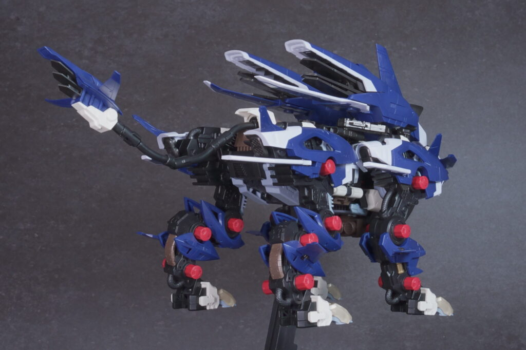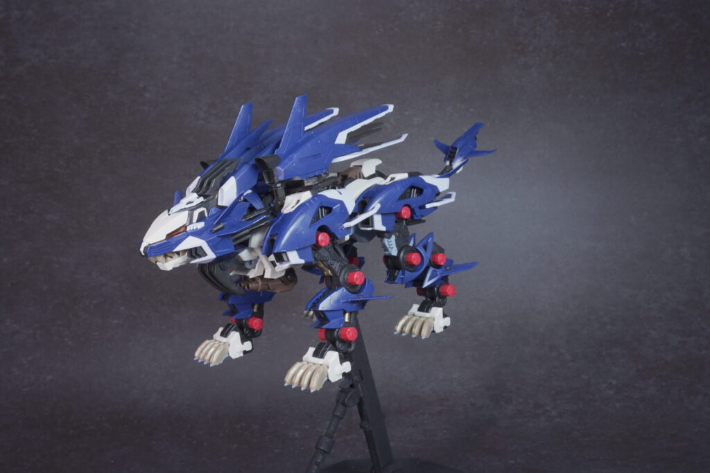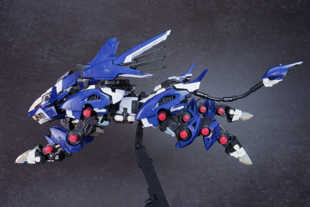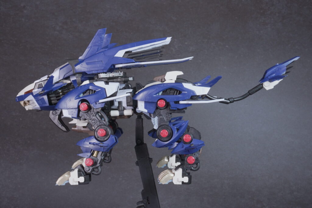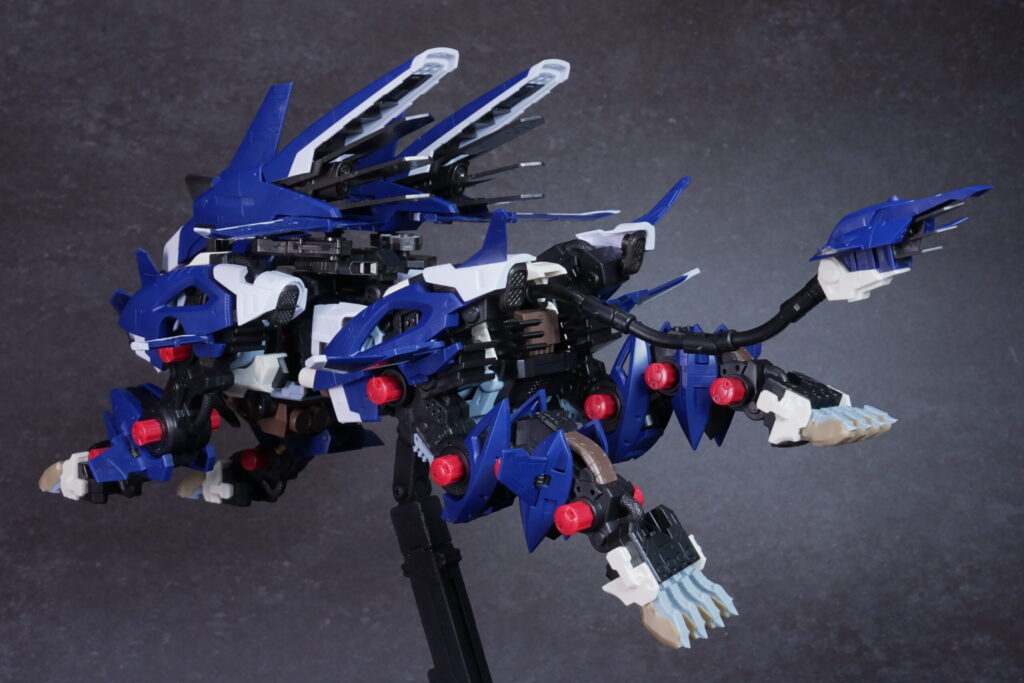 完成したライガーゼロ イエーガーは、高速戦闘形態らしい鋭利なシルエットと、深みのあるネイビーの成型色が非常にクールな仕上がり。素体となるライガーゼロのしなやかなプロポーションを活かしつつ、全身に装備された追加アーマーと大型ブースターが圧倒的なボリューム感を演出しています。