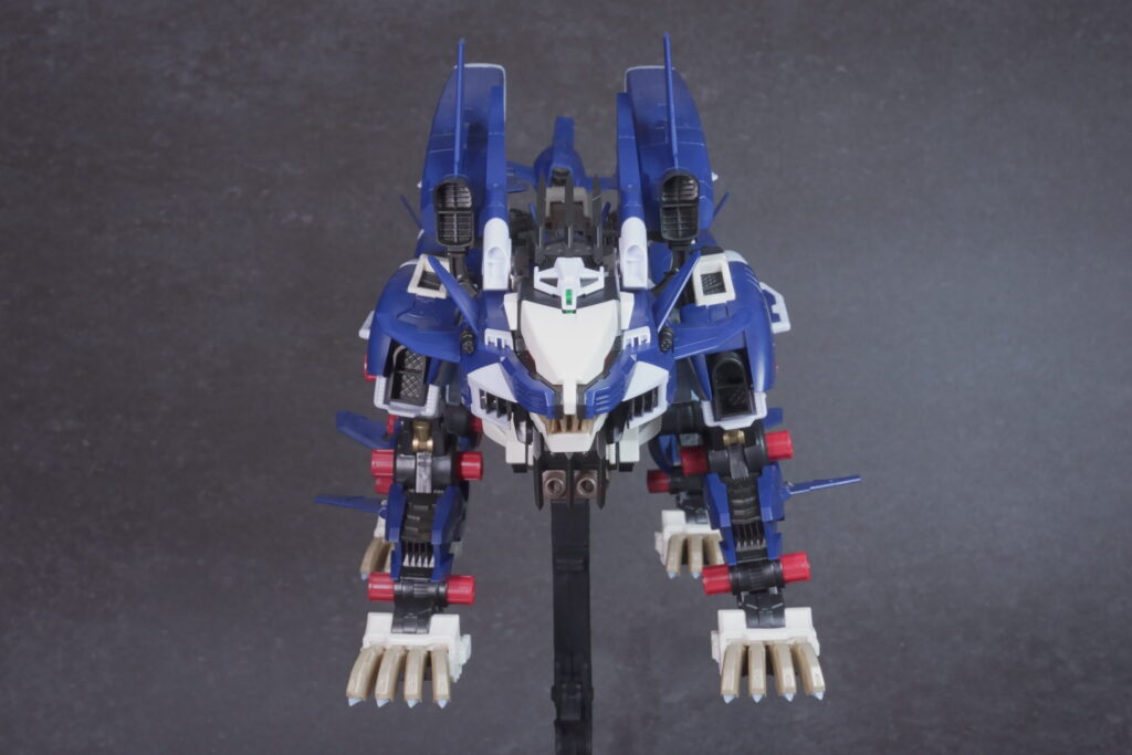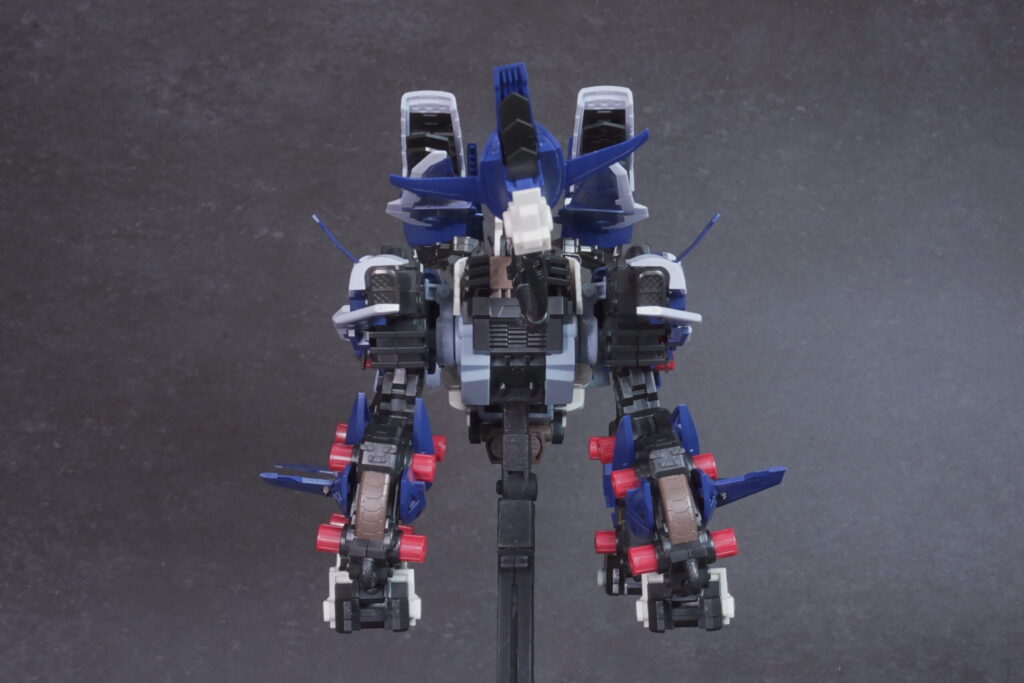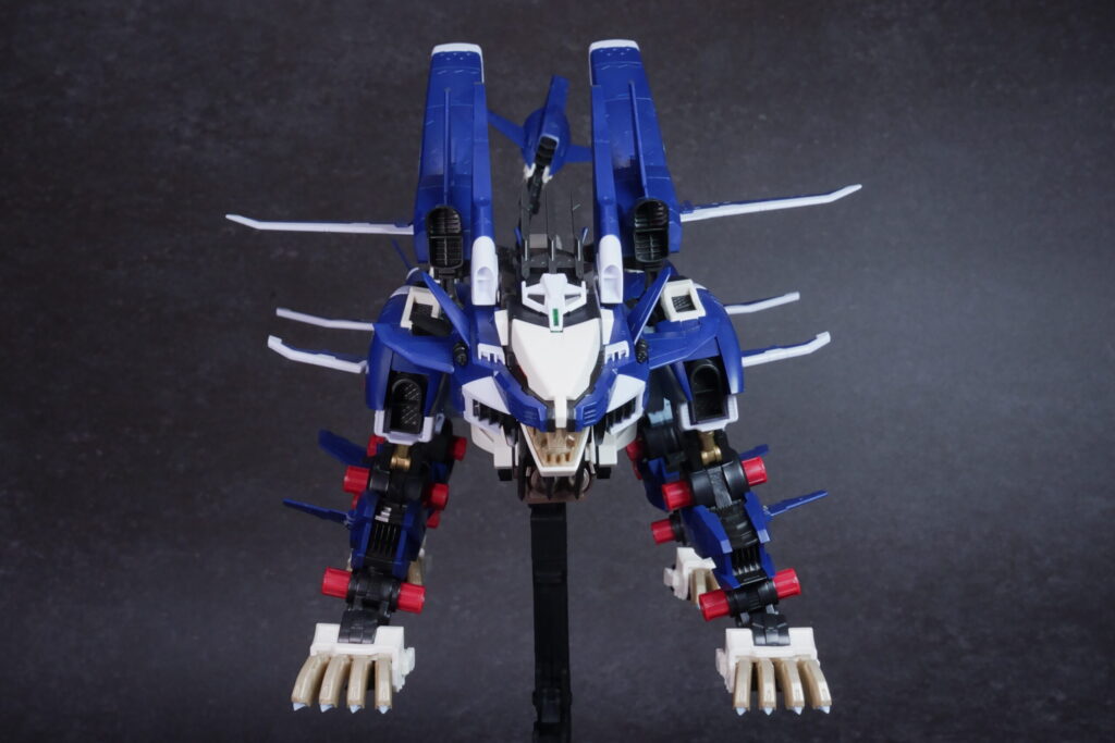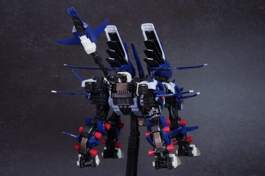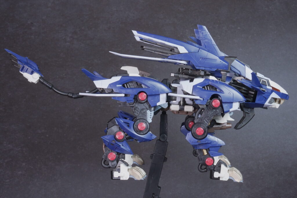 完成したライガーゼロ イエーガーは、高速戦闘形態らしい鋭利なシルエットと、深みのあるネイビーの成型色が非常にクールな仕上がり。素体となるライガーゼロのしなやかなプロポーションを活かしつつ、全身に装備された追加アーマーと大型ブースターが圧倒的なボリューム感を演出しています。