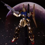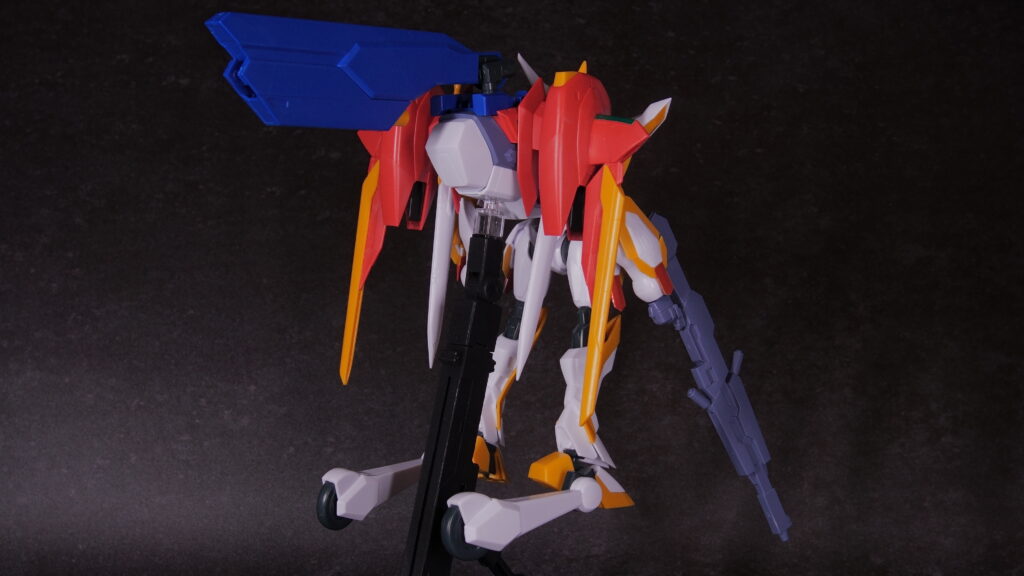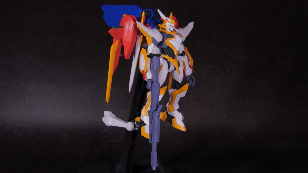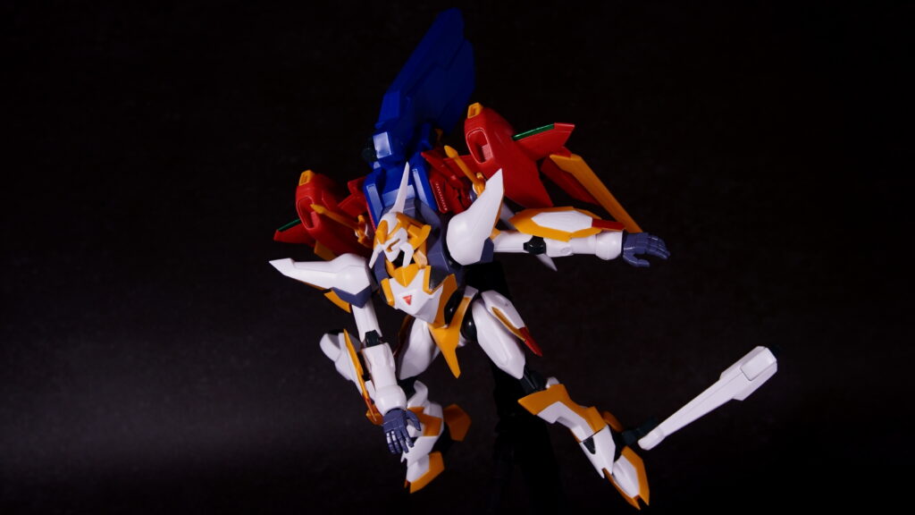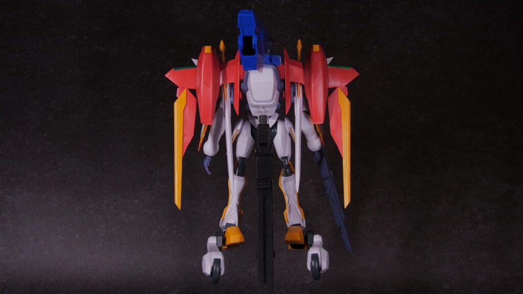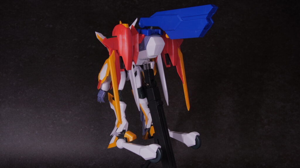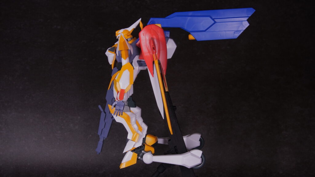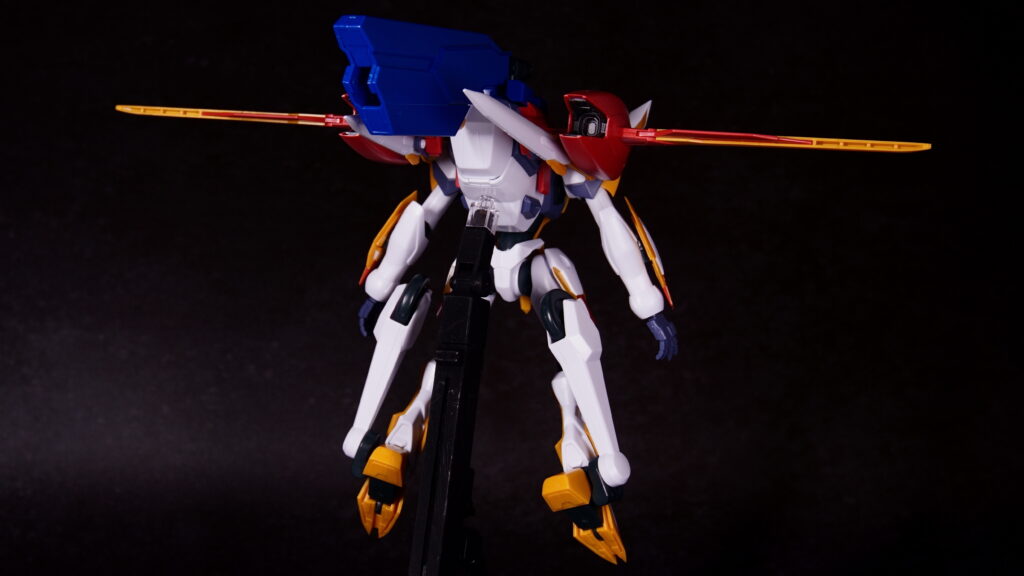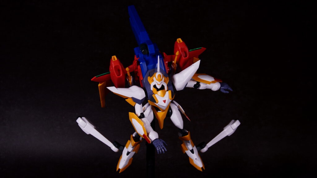 | 可動範囲 | 肩・肘・膝の可動は広く、剣を振るポーズや両手でのハドロンブラスター構えも可能。 背部ユニットが干渉するため腰回りの可動はやや制限されますが、スタンドを使用すれば飛行姿勢も自然に決まります。 |